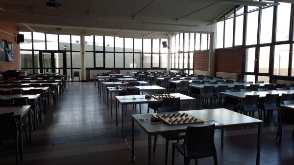 De zaal is er al klaar voor. Nu nog de spelers en de opstellingen, dan kunnen de lichten aan. Klaar voor de sportieve strijd.